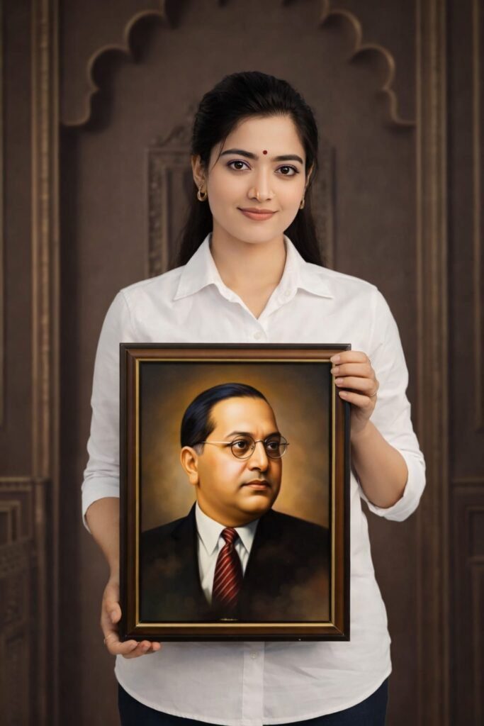 Ultra-realistic DSLR portrait of a young Indian woman, standing straight and facing camera, holding a framed portrait of Dr. B. R. Ambedkar in both hands at chest level.