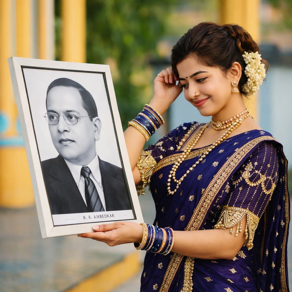 Ultra-realistic DSLR portrait of a young Indian woman in a traditional Maharashtrian look, standing outdoors in a semi-side pose, smiling softly while looking at a framed black-and-white portrait of Dr. B. R. Ambedkar held in her right hand.