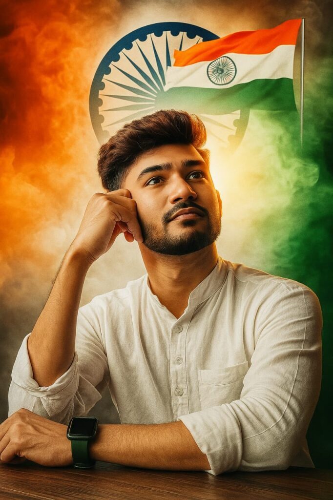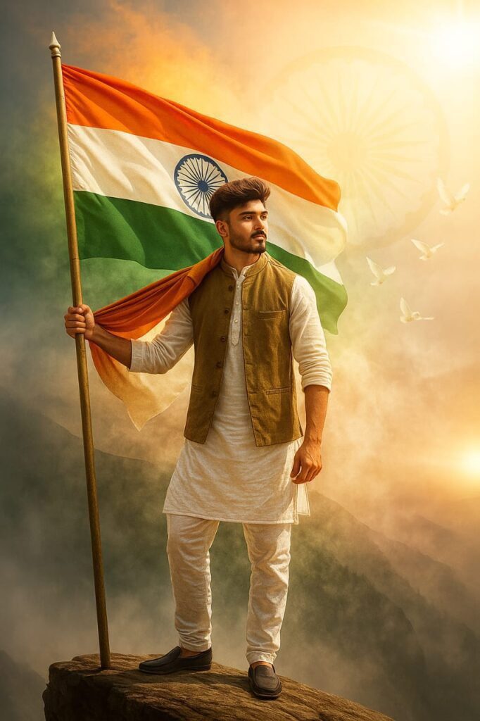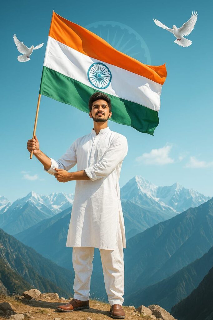 Prompt:- "A powerful and serene digital portrait of a young Indian man standing proudly on a mountain peak, wearing a traditional white kurta-pajama. He holds the Indian national flag firmly in both hands as it waves dramatically in the wind. His face glows with calm pride, gazing slightly upward with hope and dignity. Bright natural daylight bathes the entire scene, enhancing the crispness of the white kurta and the vivid colors of the tricolor. Behind him, the majestic Himalayas stretch into the distance. Two white doves fly across the clear blue sky, symbolizing peace and freedom. The Ashoka Chakra glows faintly behind his head like a spiritual halo, evoking unity and truth.