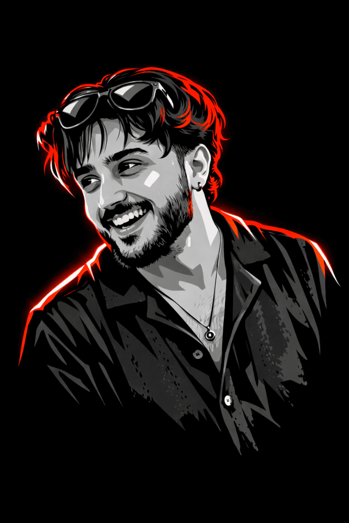 A high-contrast vector illustration of a young person with curly hair and sunglasses perched on his forehead. The art style uses a grayscale palette for the face and clothing, featuring sharp cell shading and deep black shadows. Intense neon red rim lighting outlines his silhouette and hair against a solid black background. Minimalist, modern, and edgy graphic design style.
