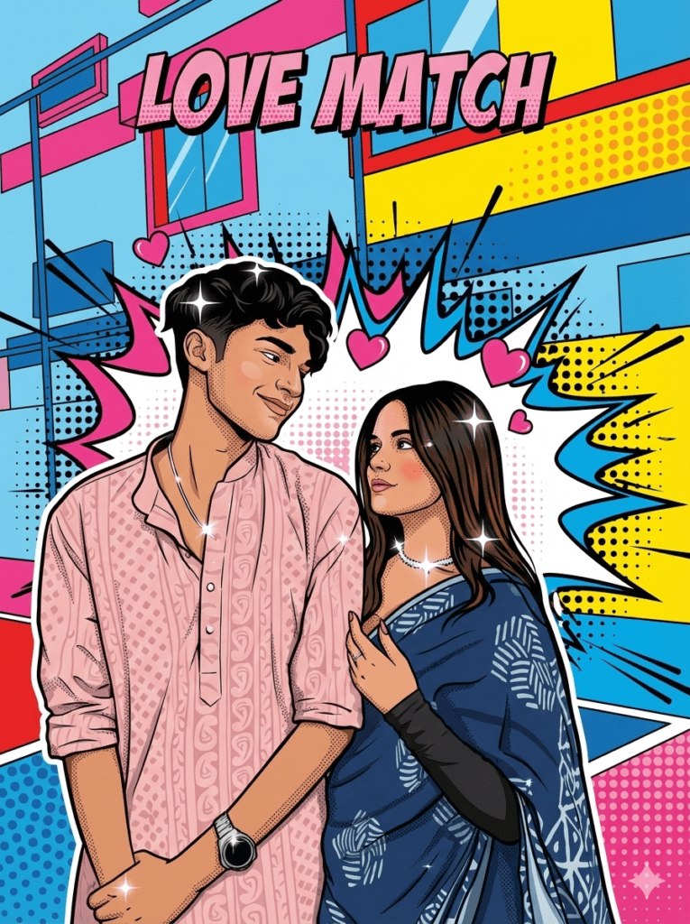 Transform the image into a high-end professional pop-art vector illustration. Use Clean vector shapes with accurate facial features, soft cartoon detailing, minimal halftone shading. Add comic bursts, dotted patterns, motion lines, energy effects, spark highlights using the photo's dominant colors. Bold outlines, crisp edges, vibrant balanced colors, fully color-adaptive pop-art background and some cute pink hearts!"