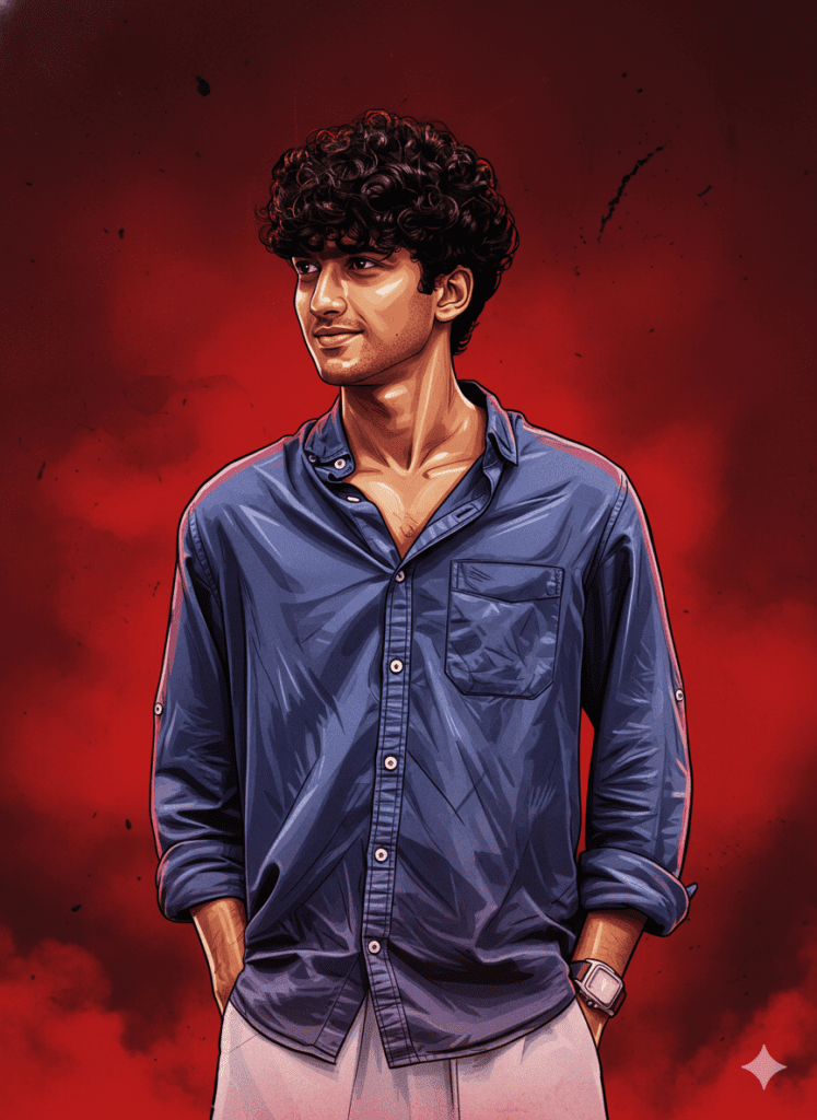 Create a cinematic digital illustration of the person in the reference photo Maintain the exact face identity hairstyle, expression skin tone and pose with zero distortion Transform the entire scene into a deep red high contrast Tamil gangster movie poster style. Replace the background with red gradients smoky atmosphere and subtle textures. Add bold comic book shading thick outlines, strong black shadows and glossy highlights on the skin and clothes. Stylize the outfit with richer tones clean folds and dynamic lighting while keeping the original clothing design Add intense highlights to the jawline cheekbones and edges of the body. Maintain the original pose and attitude Create a gritty powerful cinematic mood with dramatic lighting and high contrast Ultra-detailed sharp lines vibrant red atmosphere action movie poster energy, 4K illustration.