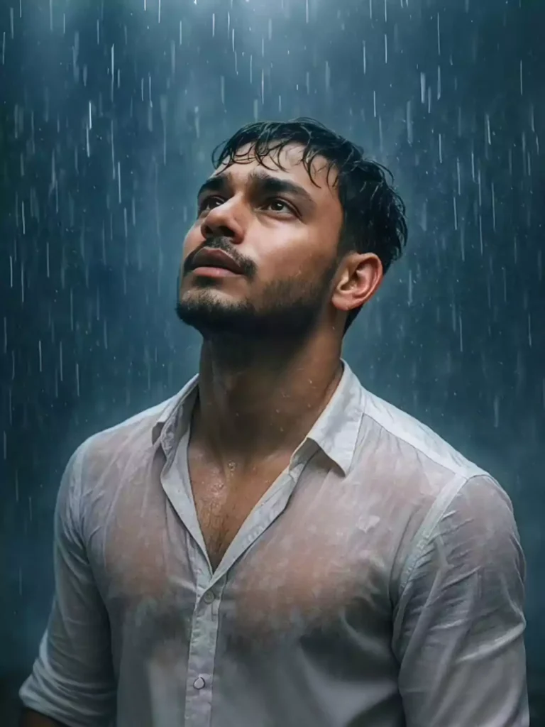 Prompt –A stylish model standing in heavy rain, soaked and expressive, wearing a semi-wet white dress shirt with subtle transparency, artistically clinging to his form. He looks upward with a cinematic, emotional expression. Rain droplets suspended midair, dramatic lighting with cool blue tones, soft mist in the background, shallow depth of field. Editorial fashion shoot style, aesthetics, captured in ultra-high resolution