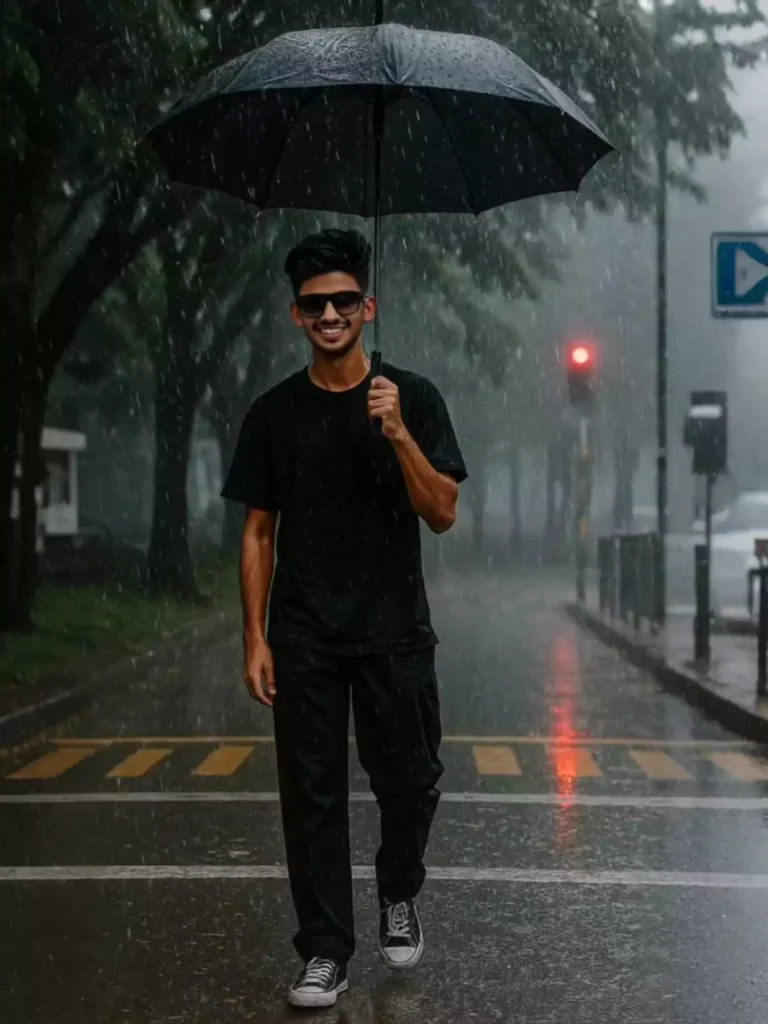 prompt – Wearing an oversized black t-shirt, black box pants, snekers.using an umbrella on the sidewalk about to cross the road at a red light, many trees, beside the sidewalk.heavy rain. Ratio 9:16
