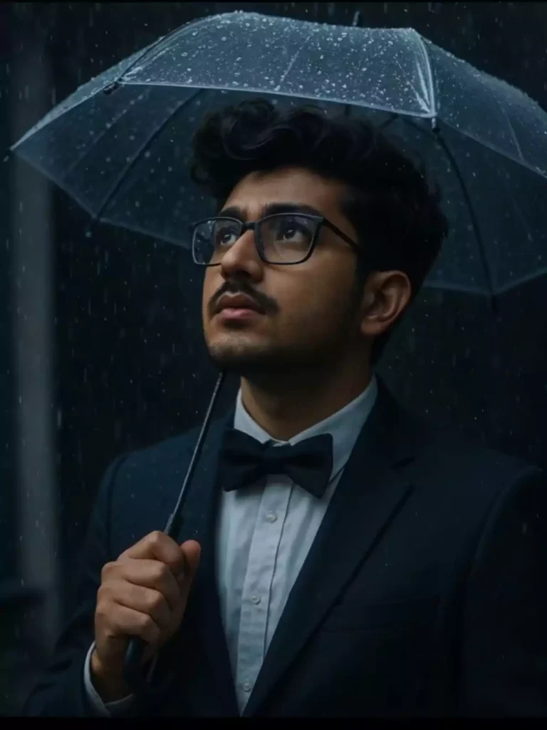 Prompt – “A cinematic portrait of a young man standing in the rain under a transparent umbrella, soft lighting, moody and melancholic atmosphere, water droplets clearly visible, dark background with shallow depth of field, elegant clothing with golden embroidery, dramatic look upwards, cool blue and teal color grading, highly detailed, realistic style.”