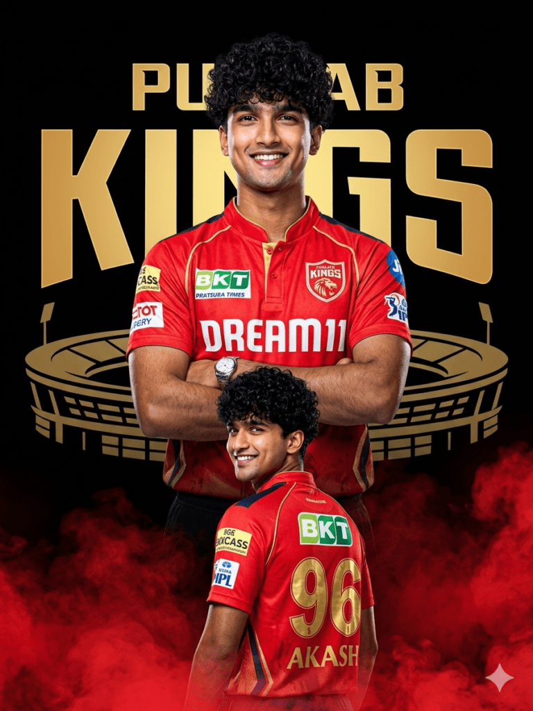 Punjab Kings fans can use this prompt to generate a powerful cricket poster. The AI will create a sports-style poster with professional lighting, stadium background, and a realistic cricket player look.