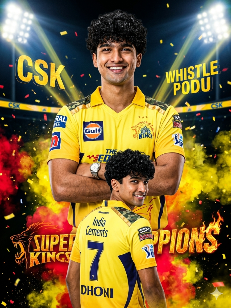 If you support Chennai Super Kings, this prompt can transform your photo into a champion-style CSK poster. The yellow jersey, stadium lights, and celebration effects will give your image a strong IPL vibe.