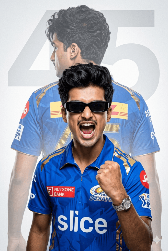 A high-quality sports poster featuring a young boy with quiff-style, tousled mid-length black hair and a light mustache, wearing rectangular black sunglasses. He is dressed in a Mumbai Indians (MI) cricket jersey in iconic royal blue and gold, with official MI branding and sponsor logos. The design uses a powerful double exposure effect: in the foreground, he is captured mid-shout in an intense, triumphant celebration with a clenched fist; in the background, a larger, faded silhouette of him is shown from behind, displaying the name "Akash" and the jersey number "45". The background is a clean, textured light gray with a large, subtle "45" watermark. Cinematic lighting, dramatic contrast, sharp focus, ultra-detailed 8K resolution, professional sports poster graphic design style. Enable strict facial consistency mode.Prioritize the facial features from the provided reference image for all subsequent generations.Maintain the subject's identity accurately while only adapting the pose,lighting,and background.Do not alter the core facial structure. in big verticle poster size.