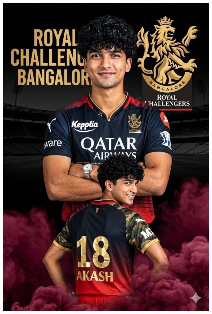 Create a dramatic IPL-style poster using my photo. Keep my facial features exactly the same as in my photo but put me in a ROYAL CHALLENGEERS BANGALORE style jersey, in 2025 style, with sponsor logos in white on the chest and sleeves. Make two versions of me: one large portrait from the chest up with arms crossed and a confident smile in the center, and one back-body image of me below wearing a RCB jersey with golden colour 18 AKASH in back and army print in both shoulders smiling,surrounded by MARRON smoke at the bottom. Use a dark black background with a large RCB  logo in text golden 'Royal Challengers Bangalore' stadium silhouette behind me, similar to a cricket team emblem. Use vivid, high-contrast lighting to make my face and jersey stand out. Make the overall style sharp, colorful and suitable for a sports poster. Enable strict facial consistency mode.Prioritize the facial features from the provided reference image for all subsequent generations.Maintain the subject's identity accurately while only adapting the pose,lighting,and background.Do not alter the core facial structure. in big verticle poster size.