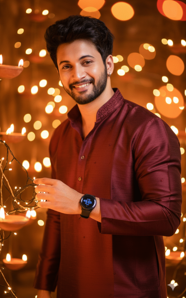Ultra-realistic 8K DSLR festive portrait of the same young man (face must remain 100% identical to the reference without changes). He is dressed in a rich deep maroon kurta with subtle embroidered texture, wearing a round black smartwatch. Shot waist-up, one hand rests lightly on glowing fairy lights while the other stays relaxed by his side. He gives a wide confident smile, looking directly at the camera. The background is filled with soft glowing diyas. (lamps), blurred fairy lights, and warm Diwali bokeh for a rich festive ambiance. Cinematic low-angle framing, natural skin tones, sharp realistic textures, professional 8K DSLR clarity.Make sure the face remains the same and 100% preserved.