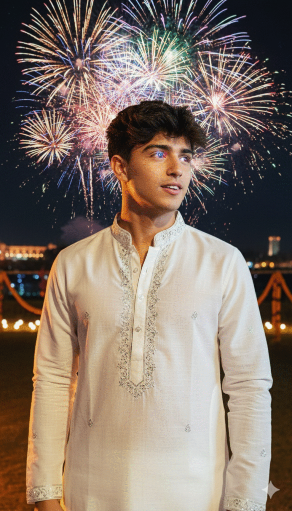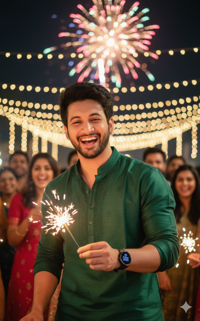Ultra-realistic 8K DSLR festive photo of the same young man (face must remain 100% unchanged from the reference). He is wearing a stylish deep green kurta with fine embroidery texture, along with a round black smartwatch. He is captured outdoors at night, holding a sparkler (phuljhari) in one hand while laughing joyfully, his face glowing in the light. The background shows blurred colorful firecrackers bursting in the sky, fairy lights strung across and a lively Diwali crowd. Cinematic warm lighting, golden tones, dreamy bokeh, shallow depth of field, photorealistic skin. details, professional 8K DSLR clarity. Make sure the face remains the same and 100% preserved.