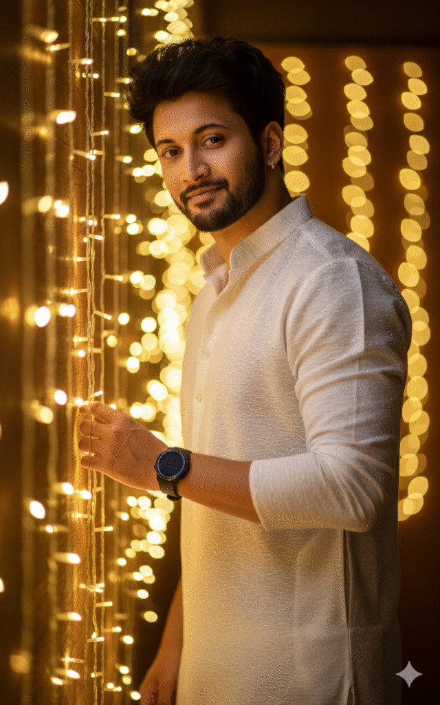 A young man in a stylish white gray kurta with fine texture, standing near glowing golden fairy lights. He is facing slightly sideways with one hand resting gently on the string lights while the other hand is relaxed by his side. His gaze is directed confidently towards the camera with a soft smile, giving a charismatic presence. The shot is taken from a slightly low-angle perspective, making him look taller and more dominant in frame. Golden fairy lights create dreamy bokeh around him, softly blurring into the background. His hairstyle is voluminous, neatly styled, with a sharp beard and clean features Cinematic lighting, shallow depth of field, hyper-realistic details 4k ultra high quality, photorealistic, festive warm tones, professional DSLR wearing round black smartwatch, fix uploaded photo propikes in this description, face no change, 8k quality realistic picture, Make sure the face remains the same and 100% preserved.