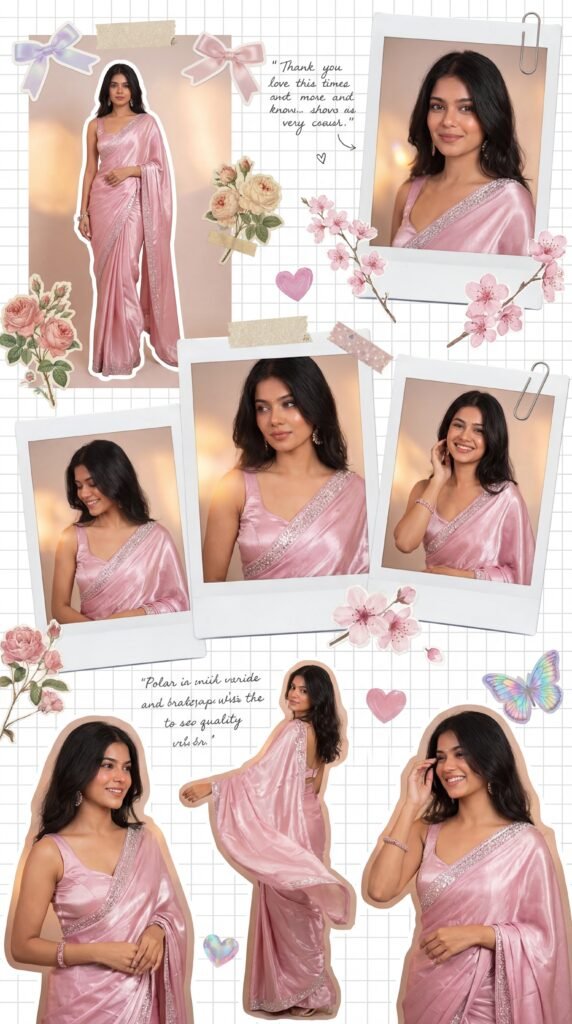 The concept should focus on a single girl wearing a shiny pastel pink saree, captured in multiple angles and poses. The mood must remain soft, dreamy, and feminine.