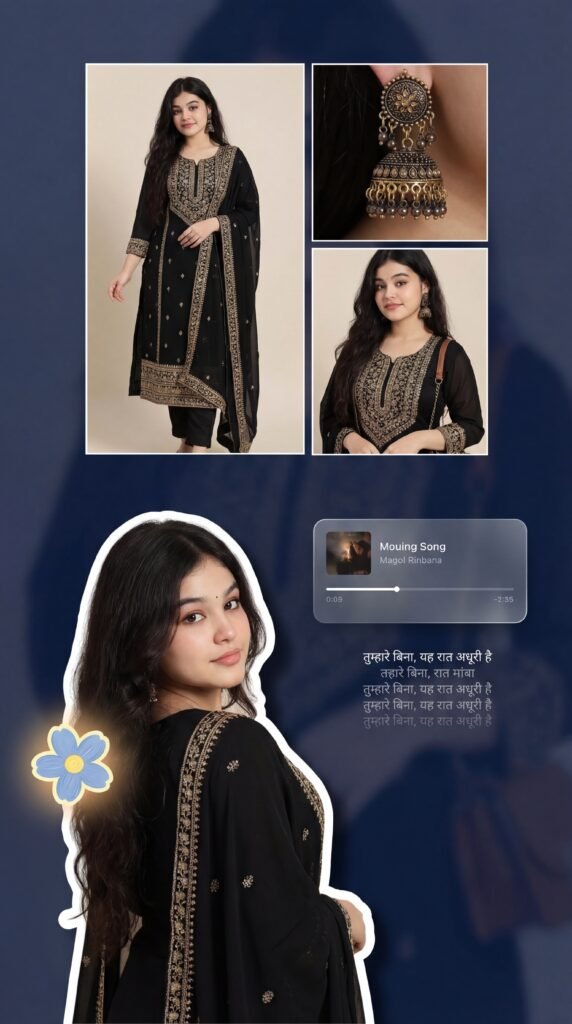Left: full-body shot wearing a black traditional Indian suit (ethnic salwar-kameez/kurti set, festive fabric, NOT formal office wear)