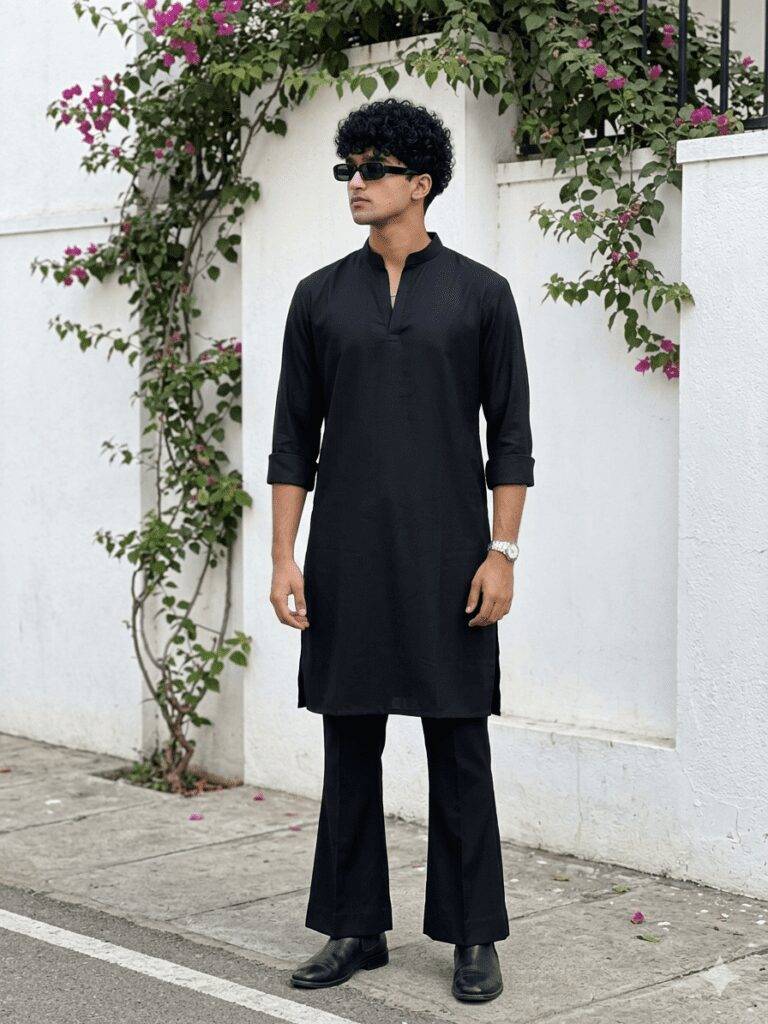 If you want a balanced and stylish combination, pairing a premium kurta color with black trousers often works beautifully. Black pants create contrast and make the kurta color stand out more. Accessories like a silver wristwatch, black sunglasses, and Chelsea boots can make the overall outfit feel even more polished and fashionable.