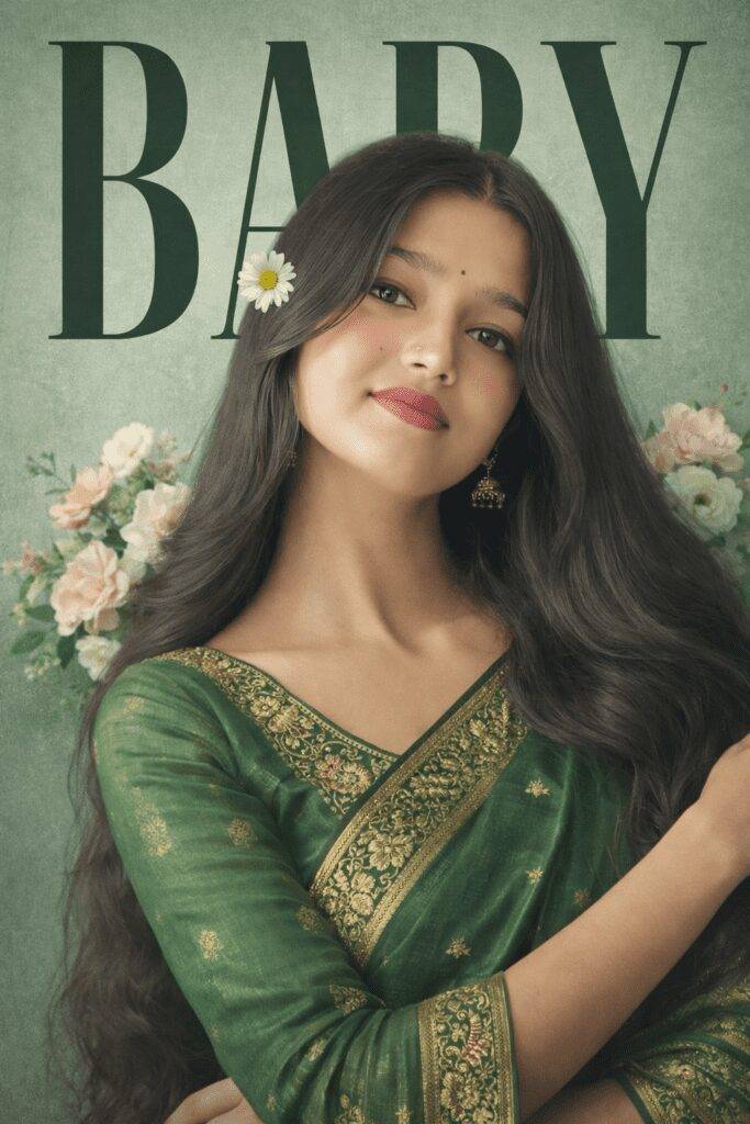 Ultra-realistic cinematic poster of the same person from the uploaded reference image, exact same face, hairstyle, expression, skin tone, pose, and proportions, 100% face match, wearing a traditional green silk saree with gold embroidery, medium close-up portrait, soft studio lighting with natural skin highlights, vintage editorial color grading, clean professional cutout with realistic depth and shadow, pastel green textured background, large bold tall condensed typography “BABY” behind the person in dark green color replacing any other text, perfectly aligned perspective and spacing, elegant floral elements (soft pink and white flowers) placed behind shoulders, one white daisy flower tucked near the hair, premium magazine cover composition, sharp focus, ultra detailed skin texture, professional graphic design, balanced lighting, depth of field, 8K resolution, extremely realistic, no face change, exact identity preservation.
