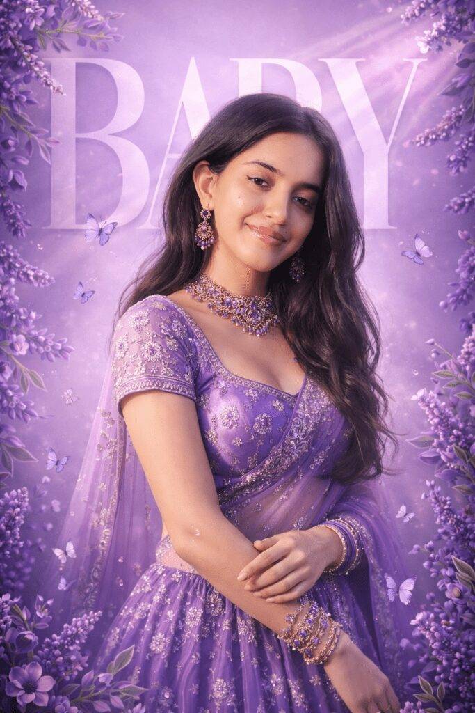 use the exact same face from the reference image, identical facial features, same identity, no changes in face Create a high-quality 3:4 vertical poster with a soft purple gradient background. Add realistic 3D lavender flowers and leaves around the borders, along with small floating butterflies for a dreamy aesthetic. Place the same girl from the reference image in the center, slightly turned sideways with a natural pose. Maintain exact facial features, realistic skin tone, sharp details, and soft glowing light on the face. She should wear a beautiful traditional outfit (lehenga or pavadai) matching the purple theme, with elegant jewelry. Add the name "SARA" in large bold modern typography in the background, combining both vertical and horizontal layout with subtle depth and shadow. No "Happy Birthday" or any greeting text. Use depth effects, soft light rays, shadows, and cinematic studio lighting to create a premium, elegant look. Ultra-detailed, 4K resolution, sharp focus, vibrant colors, soft glow, high contrast, professional poster design --ar 3:4 --style raw
