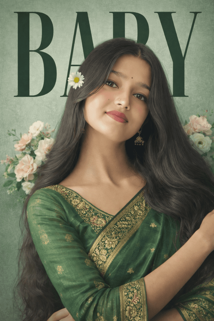 Ultra-realistic cinematic poster of the same person from the uploaded reference image, exact same face, hairstyle, expression, skin tone, pose, and proportions, 100% face match, wearing a traditional green silk saree with gold embroidery, medium close-up portrait, soft studio lighting with natural skin highlights, vintage editorial color grading, clean professional cutout with realistic depth and shadow, pastel green textured background, large bold tall condensed typography “BABY” behind the person in dark green color replacing any other text, perfectly aligned perspective and spacing, elegant floral elements (soft pink and white flowers) placed behind shoulders, one white daisy flower tucked near the hair, premium magazine cover composition, sharp focus, ultra detailed skin texture, professional graphic design, balanced lighting, depth of field, 8K resolution, extremely realistic, no face change, exact identity preservation.What makes this portrait stand out is the soft studio lighting with natural skin highlights. It keeps the face realistic and detailed while delivering a high-end magazine vibe. The medium close-up framing also helps focus attention on expression, texture, and styling.