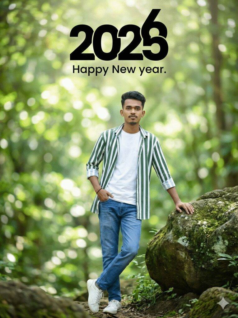 A young man standing outdoors in a natural setting, wearing a white t-shirt layered with a green-and-white striped open shirt. He has short, neatly styled dark hair and a relaxed pose, one hand in his pocket and the other resting casually on a rock. The background is soft and blurred with greenery, giving a smooth bokeh effect. Above him, modern bold typography displays “2025” with an artistic overlapping “6,” along with the text “ Happy New year.” Bright, calm lighting with a fresh,