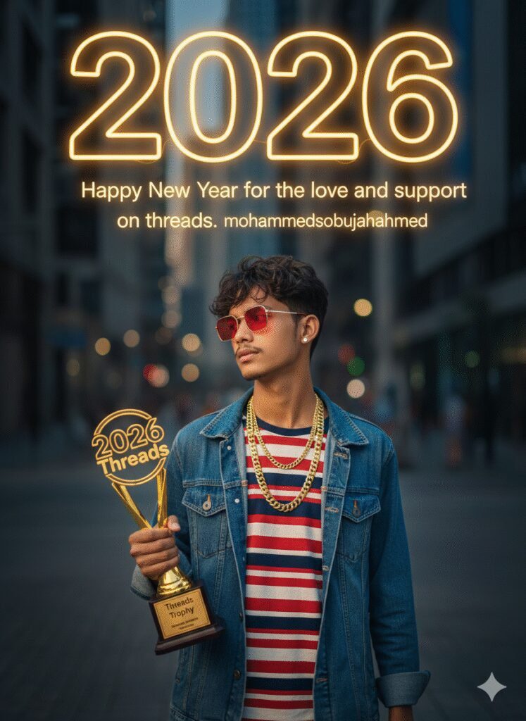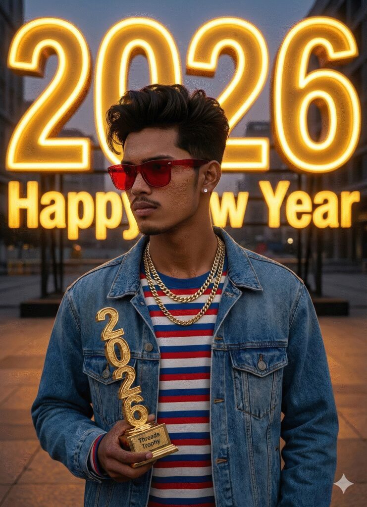 Prompt: Create a hyper-realistic, ultra-detailed 100% same photo hair,and is wearing a vintage horizontal striped oversized full-sleeve shirt,layered gold Cuban chain necklaces, and a single small diamond earring.His red sunglasses .8k ultra HD of aman with your reference face standing in a Mordern denim jacket red a golden "2026" Threads trophy. Behind him, giant glowing "2026" numbers, golden follower -gold text: "Happy New Year" for the Love And Support on Threads. @mohammedsobujahmed