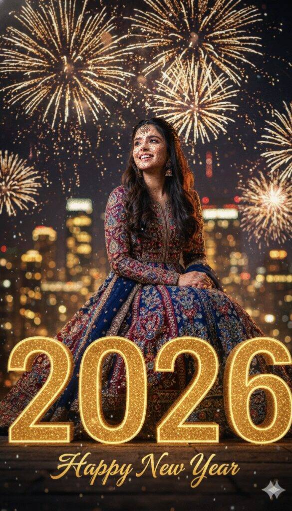 > 8K ultra-realistic Happy New Year 2026 celebration scene — A beautiful young woman sitting on top of the glowing 3D “2026” numbers, wearing an elegant Indian-style festive dress, with golden lights and fireworks in the background. Soft colorful lighting reflects on her face. “Happy New Year” text written below in stylish golden font, the atmosphere is full of sparkle, bokeh, and joy — cinematic lighting, dreamy background, detailed texture, photorealistic.