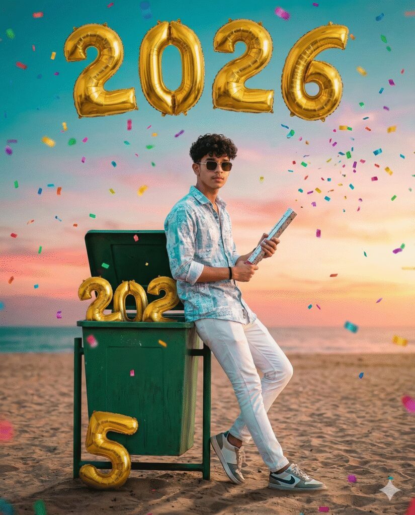 Ultra-realistic, highly stylized portrait of a young stylish man standing on a beach at sunset, leaning casually against a green dustbin. Gold foil balloon numbers '2026' floating above his head in the sky. Inside the open dustbin, gold balloon numbers '202' placed as if thrown away, and a single golden balloon number '5' lying near the bottom edge. Colorful confetti falling in the air, festive celebration vibe. The man is wearing fashionable sunglasses, modern hairstyle, light blue and white outfit, slim-fit pants, and sneakers. He holds a silver confetti cannon in one hand. Soft glowing light, teal and pink sky gradient, shallow depth of field, smooth shadows, cinematic editing, highly detailed 8K ultra-realistic photo, Instagram-style digital art look. Use same to same face as given reference pic."