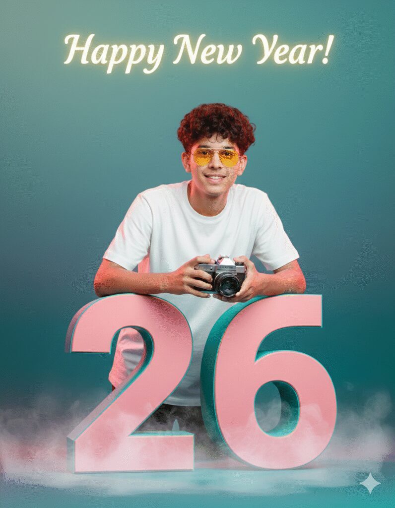 A with medium-length, and, wearing yellow-tinted aviator sunglasses and a white short-sleeve shirt. He is smiling softly while holding a vintage DSLR camera in his hand. The man is leaning casually on a small happy new year large 3D number "26" rendered in pink and teal tones. The background features a smooth gradient of warm pink, coral, and teal colors with a soft cinematic glow. The lighting is bright and vibrant, giving the scene a modern poster like aesthetic. Add subtle smoke/mist at thebottom for dramatic effecStep 1: Choose a High-Quality Photo
