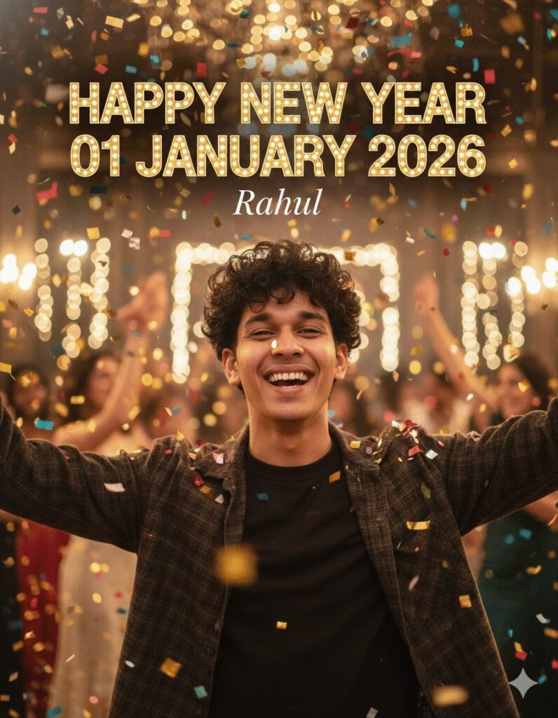 An expressive shot of a joyful 20-year-old boy, smiling, with slightly messy, black, voluminous hair catching the light. He is standing amidst golden confetti and streamers falling around him. Background: Out-of-focus New Year's Eve party setting. Superimposed on the image, the text 'HAPPY NEW YEAR 01 JANUARY 2026' Rahul is stylized like a sparkling, large marquee sign. Dynamic pose,