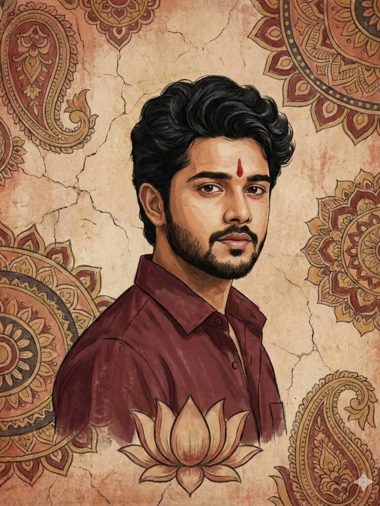 contrast.Art Style: Hand-illustrated, digital painting, Indian classical art fusion, folk art texture, vintage
