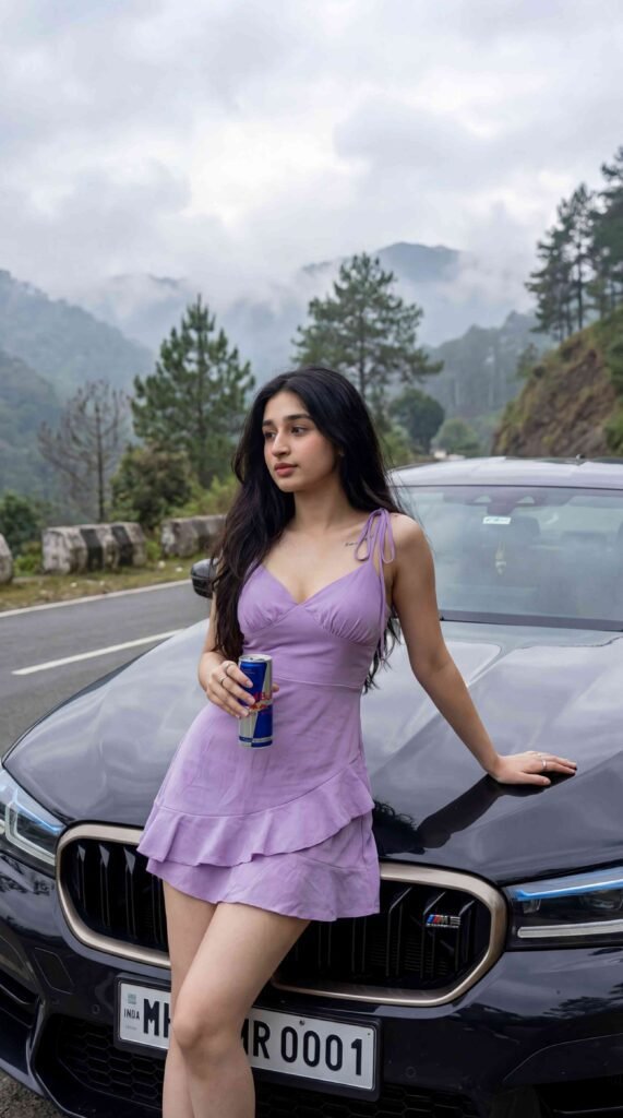 Ultra-realistic 8K photo, my face preserved 100% exactly as uploaded.Young woman leaning confidently near the hood, looking slightly left, beside a black BMW M5 Competition on a mountain road.IMPORTANT:She is wearing EXACTLY the same clothes as in the uploaded photo.NO outfit change, NO color change, NO logo change, NO styling change.Dress, fabric, fit, accessories — everything must remain identical to the original photo.Pose & body:Exact same pose, angle, posture, hand placement, body proportions as the original image.Pose details:Right hand holding a Red Bull can, left hand resting on the car, confident attitude expression.Car details:BMW M5 Competition, black metallic paint, realistic reflections, Indian number plate MH 05 MR 0001.Background:Hyper-realistic Meghalaya hills, misty mountains, pine trees, overcast soft daylight, fully sharp.Strict rules:NO face changeNO dress changeNO pose changeNO blurNO CGINO extra objectsUltra-realistic, photorealistic, DSLR quality, natural lighting.