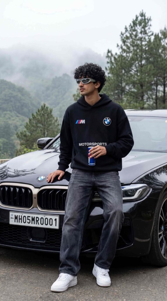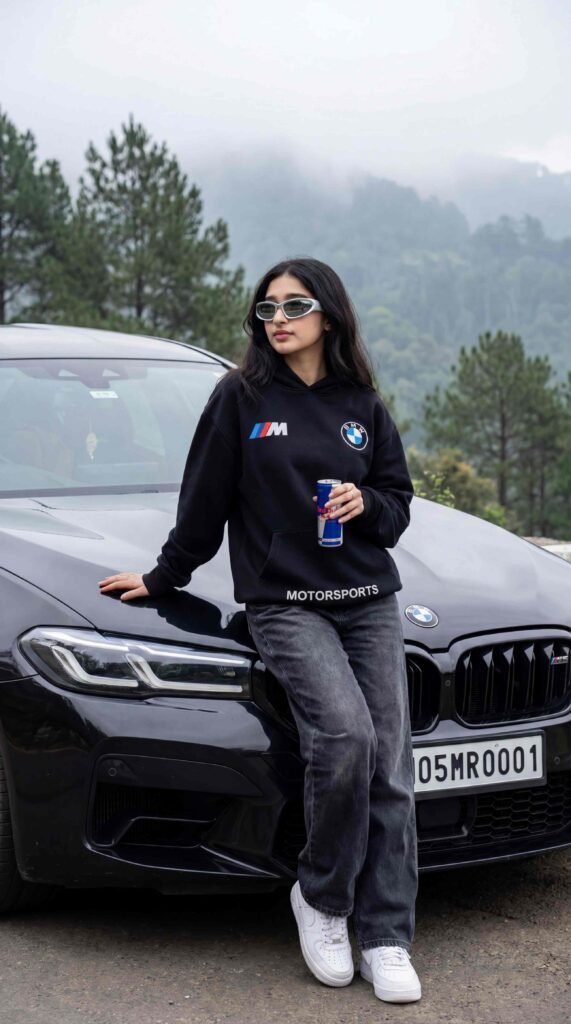 Ultra-realistic 8K photo, my face preserved 100% exactly as uploaded.Young woman leaning confidently near the hood, looking slightly left, beside a black BMW M5 Competition on a mountain road.Exact same pose, angle, posture, and hand placement as the reference image.She is wearing a black oversized hoodie with:BMW logo on right chest, M Series logo on left chest, “MOTORSPORTS” text at lower center.Outfit & accessories:Wraparound Y2K sunglasses, baggy grey-black jeans, white Air Force sneakers.Pose:Right hand holding a Red Bull can, left hand resting on the car, confident bold attitude expression.Car details:BMW M5 Competition, black metallic paint, realistic reflections, Indian number plate MH 05 MR 0001.Background:Hyper-realistic Meghalaya hills, misty mountains, pine trees, overcast soft daylight, fully sharp focus.Rules:No face change, no pose change, no blur, no CGI, no extra objects, ultra-realistic, photorealistic, DSLR quality.