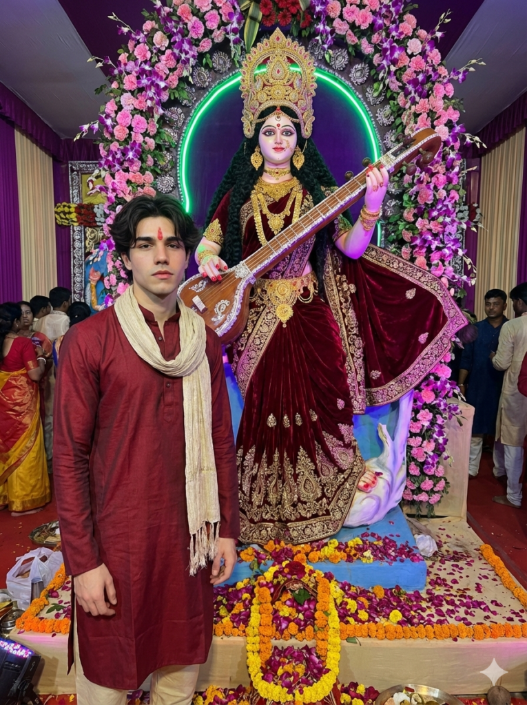 Create a photorealistic 8K image of a stylish young Indian boy wearing a dark red kurta, light pajamas, and a light scarf around his neck, black hair, red tilak on forehead, looking respectfully at the camera. Background Grand festival pandal with Goddess Saraswati statue exactly centered, wearing deep red velvet saree with gold embroidery, heavy gold jewelry and crown, holding a decorated veena, surrounded by pink and purple flowers, marigold and rose petals on the ground. Neon green and deep purple LED lights on the goddess.