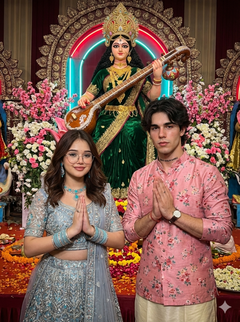 Use uploaded photo as exact face and hairstyle reference. Create an ultra-realistic 8K cinematic portrait of a stylish young couple looking at the camera, hands joined in namaste. Man: Pink floral kurta, cream pants, wristwatch. Woman Blue-silver embroidered lehenga, matching bangles, silver-turquoise necklace, dangling earrings, soft wavy hair, gentle serene smile. Background: Grand festival pandal with Goddess Saraswati idol, green velvet saree with gold embroidery, heavy gold jewelry and crown, holding decorated veena, surrounded by pink and white flowers, marigold and rose petals on the ground. Neon red and cyan LED lights on the goddess. Lighting: Direct flash, cinematic, high detail, photorealistic. AR 3:4, 8K,V6.