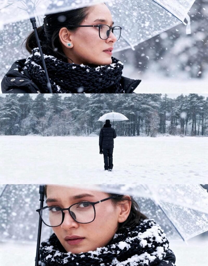 Vertical triptych of a young woman in a snowy winter landscape. Top panel: Close-up side profile looking left, holding a clear umbrella, snowflakes on hair. Middle panel: Full-body distant back view, holding umbrella in vast snow-covered forest with slender trees. Bottom panel: Extreme close-up of face looking at camera, snowflakes on hair and black chunky scarf. Subject wears dark winter jacket and black scarf. Cinematic, photorealistic, cool tones, abundant falling snow. --ar 2:3